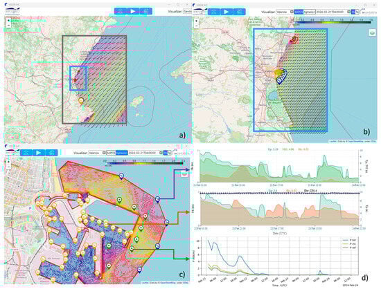 Valencia Port GUI example for (a) regional wave downscaling, (b) local wave propagation, (c) high-resolution agitation, and (d) wave forcing, wave agitation, and (total, incident, and reflected) wave potential energy forecast.