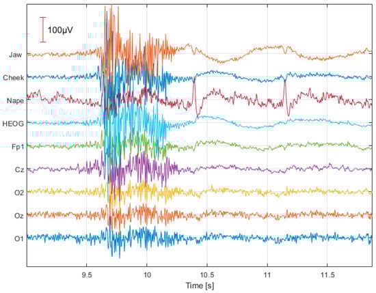 Detailed descriptions of each session, including task instructions and expected artifacts, are provided in Table 1. Figure 2 shows the EEG/EMG signals recorded during jaw clenching (without visual stimulation) for participant S01. The jaw-clenching artifact occurred around 10 s, producing a substantial amplitude increase on every electrode. Notably, these artifacts also propagate to electrodes O1, O2, and Oz.