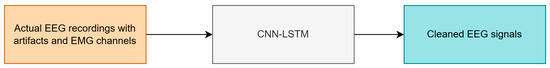The concept of using our proposed CNN-LSTM for artifact removal is illustrated in Figure 4. The network receives input from one EEG signal channel and five additional channels that provide information about muscle activity. We assume that the CNN-LSTM outputs a single channel of cleaned EEG data, free from artifacts.