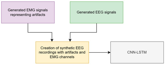 Figure 5 illustrates the schematic of the EMG signal generation process and how these signals are utilized to create EEG recordings with muscle artifacts. The CNN-LSTM was trained to output clean EEG signals, free from disturbances caused by muscle artifacts. The effectiveness of the CNN-LSTM in cleaning raw EEG signals largely depends on the quality and representativeness of the training data. The augmented EEG and EMG signals created must accurately replicate the genuine properties of real signals, including their time-frequency characteristics. Additionally, it is crucial that the training data exhibit maximum diversity—for both EEG signals and muscle artifacts. Such diversity is essential as it enables the CNN-LSTM to generalize effectively and recognize various types of artifacts in raw EEG data.