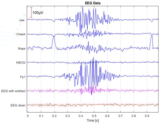 The electroencephalographic (EEG) signal is an exceptionally valuable tool for studying human brain activity [1]. Thanks to its non-invasive nature and high temporal resolution, it has broad applications in scientific research, medical diagnostics, and brain–computer interface (BCI) technology. EEG analysis allows researchers to identify cognitive processes, diagnose neurological disorders, and develop technologies that enable device control through thought. However, accurate EEG analysis can be significantly hindered by artifacts—interfering signals that do not originate from neuronal activity. Among the most common artifacts are those caused by eye movements (EOG), muscle activity (EMG), and cardiac activity (ECG) [2]. Their presence not only reduces signal quality but can also lead to incorrect data interpretation. This issue is particularly critical in clinical research and in applications such as BCI, where precision is paramount. Muscle artifacts are especially challenging, particularly in studies that require participant motor activity, such as human–machine interaction or the analysis of steady-state visually evoked potentials (SSVEP). Facial muscle movements—like jaw clenching—generate high-amplitude interference that can overshadow genuine brain signals. These disturbances are difficult to remove because of their irregular nature and because their frequencies often overlap with those of interest in EEG data.