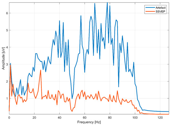 To evaluate the efficiency of EEG signal cleaning, a measure was proposed that expresses the ratio of the SSVEP signal amplitude at the SSVEP frequency to the average amplitude of the EEG signal frequencies in the 1–100 Hz range. This ratio can be defined as follows: