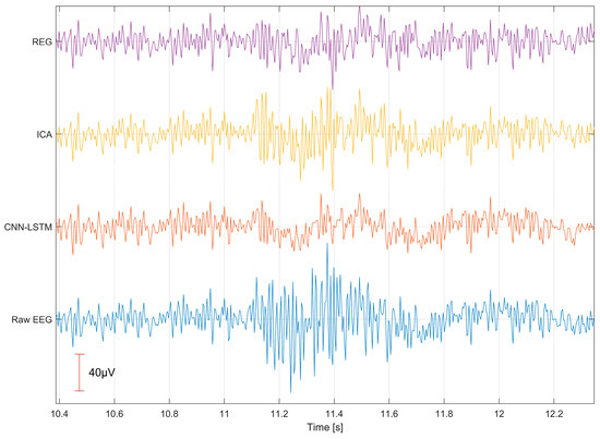 During the initial stage of our study, we also considered the use of other commonly applied EEG artifact removal methods, such as adaptive filters—least mean squares (LMS) [26] and recursive least squares (RLS) [27]—as well as artifact subspace reconstruction (ASR) [15].