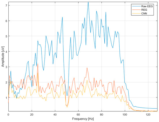 Signal spectra before (raw EEG) and after cleaning with REG and CNN-LSTM methods.
