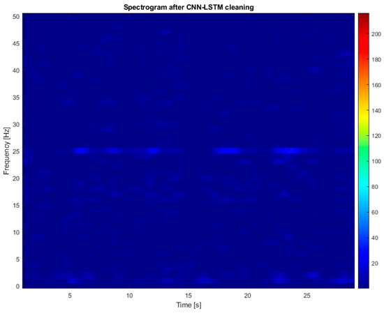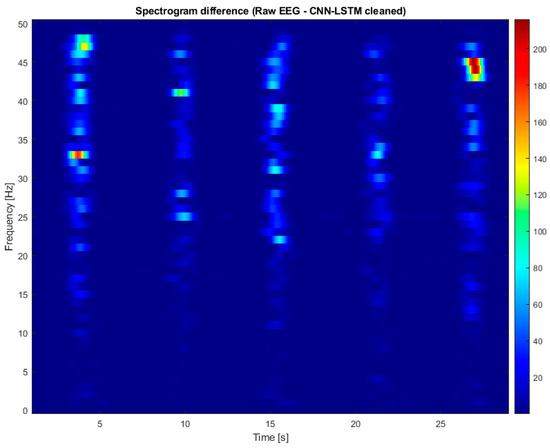 In the ICA method, a clinical neurophysiologist selected the components to remove. In many cases, it was not possible to choose only the components related to noise. As a result, the removed components also contained EEG signals and SSVEP. This made the SSVEP results inconsistent and dependent on the expert’s subjective judgment. Figure 11 shows the spectrogram after artifact removal using the CNN-LSTM method for participant S24 at electrode O2. Compared to Figure 8, the artifact-related interference has been eliminated, and the 25 Hz SSVEP is still visible. Figure 12 presents the difference in spectrograms between the original signal and the signal cleaned with CNN-LSTM. It can be seen that the CNN-LSTM method removed the artifact activity at seconds 4, 10, 16, 22, and 27. Notably, CNN-LSTM did not remove the 25 Hz frequency, indicating that the SSVEP was preserved.