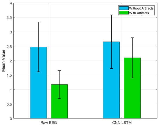It is particularly noteworthy that the CNN-LSTM method applied to signals containing artifacts (average SNR: 2.098) achieves results comparable to those of raw EEG signals without artifacts (average SNR: 2.475; p = 0.028). Another important observation is that, for artifact-free EEG signals, the SNR values remain comparable—the CNN-LSTM processing method does not introduce significant changes compared to the raw signal (raw EEG: 2.475 vs. CNN-LSTM: 2.653; p = 0.34). This indicates that applying the CNN-LSTM method effectively reduces artifact influence to levels typical of interference-free signals while preserving their original structure. In other words, this method accurately reconstructs the actual amplitudes of EEG signals.