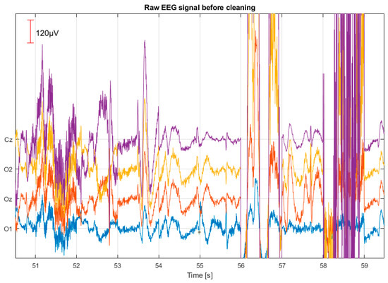 In our study, all EMG/EOG electrodes (HEOG, neck, cheek, and jaw) were used as reference electrodes. Cleaning focused on signals from the electrodes most commonly used in BCI—O1, Oz, O2, and Cz. Each electrode was cleaned sequentially using the reference channels. Regression was performed in time windows rather than applied once to the entire dataset, meaning the regression model operated on smaller, shifting segments of data (windows), allowing local temporal relationships and variability to be taken into account. The window length was experimentally set to 1 s (256 samples). A wider window would contain multiple artifacts as well as artifact-free signal segments, while a narrower window might not capture individual artifacts.