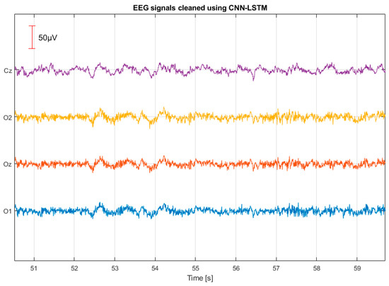 In the next stage, the CNN-LSTM neural network was trained and validated. After completing the training phase, the model was evaluated using real EEG/EMG test data. The testing phase produced cleaned EEG signals, for which the signal-to-noise ratio (SNR) coefficients were calculated as a quantitative measure of the artifact removal efficacy.