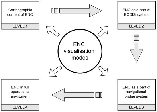 Therefore, we can distinguish four levels of modes of ENC map visualisation (Figure 1). The first is the basic cartographic development, resulting from the accepted editorial principles of maps. For ENC maps, these principles are included in the IHO standards. The first level of visualisation includes the essential content of the map, that is, the topographic and cartographic model of the data. The second level stems from the functionality of ENC maps as part of the ECDIS system. This level additionally includes the interface and functionalities related to the use of the map at the operational level (e.g., visualisation of safe depths, route planning, display of various ship data or integration of data coming from other navigation devices, such as AIS or radar). The third level includes the visualisation of the ENC map as part of the navigation bridge. Information at this stage is shared with other navigation devices. Perceptually, it may be partially disturbed by additional information or posited by other navigation devices (e.g., radar). The final stage of visualisation includes the full operational environment, in which the navigator uses all available sources of information, additionally performs visual observation, and makes a real-time assessment of the navigation situation. This stage is the most complex, as it is based on the analysis of available navigational data and is related to making decisions based on them (e.g., making a manoeuvre, changing course to correct the ship’s position). Exemplary research analysing the behaviour of watch officers on the bridge and taking into account an ECDIS device is presented in []. We can also find research in other types of navigation, like aviation, where eye tracking was used for projecting the pilot’s cockpit [].