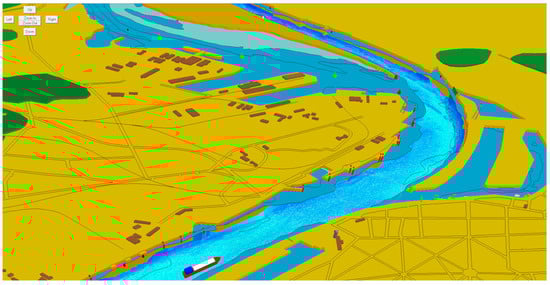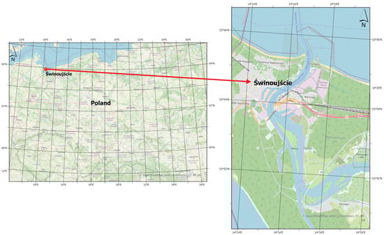 At the start, the research area was defined, specifically, a cell of the 2D navigational map. The selected cell encompasses the range of the harbour in Świnoujście, Westpomeranian Voivodeship, Poland (Figure 6).