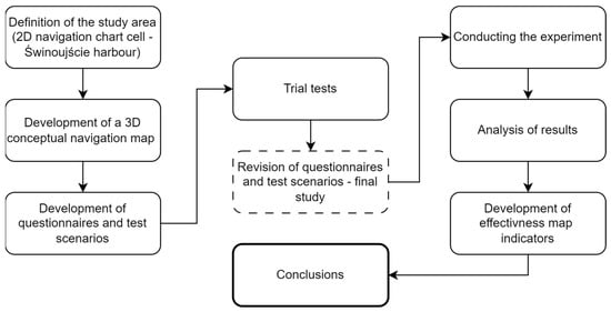 The study employed a multi-stage approach, enabling a comprehensive analysis of the effectiveness of 3D conceptual maps. The research process consisted of the following steps: initially, the study area was selected in the form of a cell from a 2D navigational map. The selection of a specific part of the map allowed for the uniform analysis and subsequent comparison of different types of maps. Based on the defined area, a 3D conceptual navigational map was developed. Subsequently, preliminary questionnaires and test scenarios were created to assess the readability and functionality of the developed maps. Before the main experiment, trial tests were conducted to evaluate the quality and usability of the research materials. The results of these tests were used to refine the scenarios and questionnaires. Based on the trial test results, corrections were made to the questionnaires and scenarios, leading to the development of their final versions. These finalised research materials were then used in the main experiment, during which participants were divided into groups testing 2D and 3D maps. The collected data were subjected to quantitative and qualitative analysis, which included indicators based on the generated heatmaps, eye-tracking measures such as fixations and saccades, and questionnaire results. The analysis of the results allowed for the formulation of general conclusions regarding the readability and functionality of navigational maps in three-dimensional space. Figure 3 provides a schematic representation of the stages of the research process.
