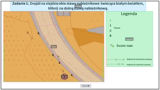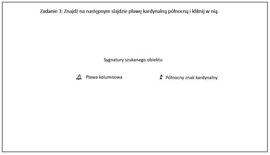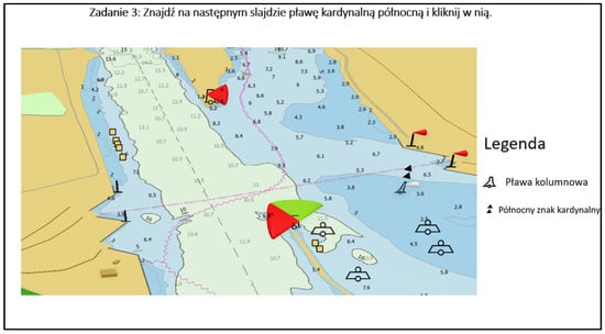 Each scenario followed a specific format: the first slide displayed the task description along with the symbols they were expected to focus on. The next slide repeated the task description and displayed a map excerpt with a legend. The tester’s task was to identify and click on the map symbol. After completing the test, testers filled out a questionnaire regarding the test scenarios. Figure 4 presents an example of a test question. The command is “Find the north cardinal buoy on the next slide and click on it”. Below the command is a legend of the map symbols of the searched object: on the left side, there is a symbol of a buoy, and on the right side, there is a symbol of a cardinal mark north.
