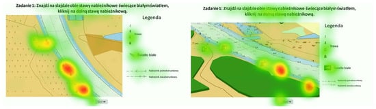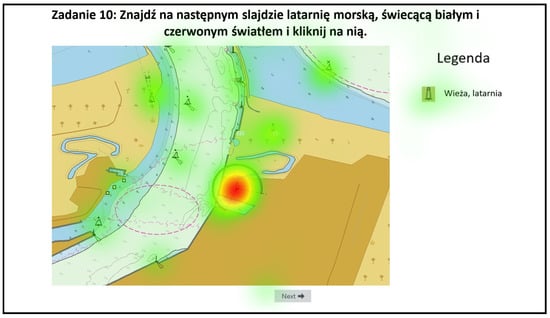 In the current work, the readability indicator was based on heatmap decomposition and processing. The testers’ attention clusters presented by heatmaps are marked in green, yellow, and red, with red indicating the highest concentration of attention. The highest concentration was found to be on a given symbol (object) on the map. Figure 13 presents the experimental result of the task, “Find the lighthouse on the slide, showing white and red light and click on it”. The legend on the right side presents the map symbols of the searched object.