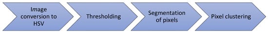 Based on the established thresholds, each pixel in the image was analysed and matched to one of the predefined colour ranges. Pixels meeting the criteria were assigned to the corresponding segmentation masks. The result of the applied segmentation is presented in Figure 11.