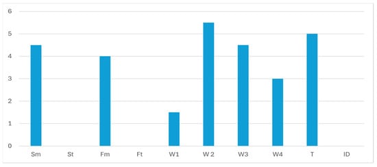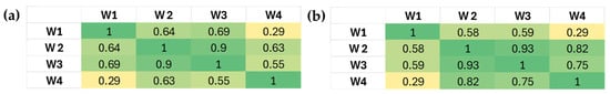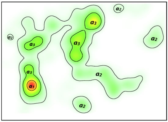After segmentation, it was possible to calculate the pixel segment areas for each segmented region. The surface areas for green, yellow, and red regions were then summed. Using the processed heatmaps and the calculated surface areas of the segmented regions, preliminary indicators for the conceptual navigational maps were developed: W1, W2, W3, and W4. W1 identifies the highest level of user attention focused on specific map objects. This indicator highlights the objects that caused the most attention or required significant cognitive effort from testers. W2 quantifies the percentage of the map’s surface that was visually explored by the testers. A higher value suggests a broader search pattern, whereas a lower value indicates focused attention on specific locations. W3 identifies the range of most intensively observed areas of the map. It helps identify which parts of the map testers found most relevant or useful. W4 evaluates how scattered the tester’s attention was across the map. A higher value means that testers visually explored a large portion of the map, while a lower value indicates that attention was concentrated within a more confined area. The formula for calculating indicators W1, W2, and W3 based on the single-scenario heatmaps for N testers is given below: