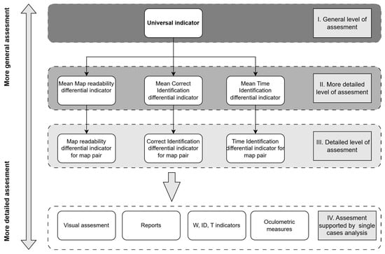 The main objective of this study was to develop a methodology based on universal indicators for assessing the effectiveness of maps using eye-tracking measurements. Traditional measures, such as the number of fixations, dwell time, or time to first fixation, are often analysed separately and are strongly dependent on specific tasks or experiment conditions, which can hinder their comparability across different map designs. The proposed indicator addresses this limitation by aggregating multiple eye-tracking parameters into a unified measure, thus enabling a more consistent evaluation of the concept map at an early design stage.