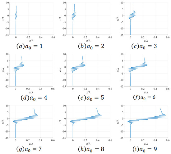 As depicted in Figure 2, the electron trajectory plots under varying laser amplitudes can be observed. Given that the incident direction of the electrons is parallel to the polarization plane of the linearly polarized laser, namely the XOZ plane, the electrons are not subject to a force in the y direction, and consequently, their trajectories remain within the XOZ plane. With the continuous enhancement of the laser amplitude, the electron trajectory exhibits virtually no change in the x-axis direction but continuously elongates in the positive z-axis direction. This is because the increase in the laser amplitude augments the longitudinal ponderomotive force of the linearly polarized laser pulse on the electron, resulting in a gradual elongation of the deflection distance of the electron along the z-axis. When the laser amplitude is extremely small, the electron merely undergoes oscillatory motions within a very narrow range before exiting. Observing Figure 2, the exit direction of the electron trajectories does not undergo a notable alteration, suggesting that the exit angle of the electron trajectories is minimally influenced by the laser amplitude.
