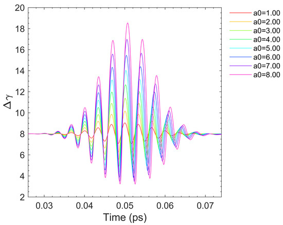 As shown in Figure 3, when observing the changes in electron energy, it can be discerned that the period of electron energy variation is independent of the laser amplitude. However, the magnitude of electron energy change augments with the increase in laser amplitude. The period of electron energy change is equivalent to the period of velocity variation, which is correlated with the beam waist radius and the delay time of the laser pulse but shows no distinct relationship with the laser amplitude. The expansion of the laser beam waist radius can broaden the laser’s action scope and extend the action time and period of the electron along the x-axis. Owing to the increase in laser amplitude, the ponderomotive force exerted on the electron in the z-axis direction intensifies, and the acceleration and deceleration processes along the z-axis become more vigorous, causing the maximum value of electron energy to be greater and the minimum value to be smaller. Consequently, overall, a larger laser amplitude will result in a greater amplitude of electron energy variation.