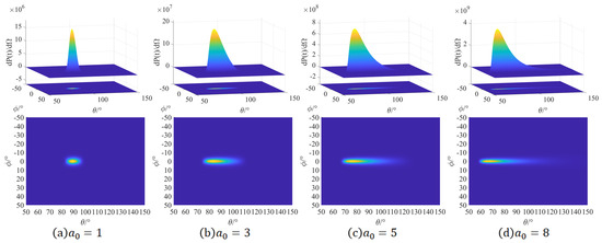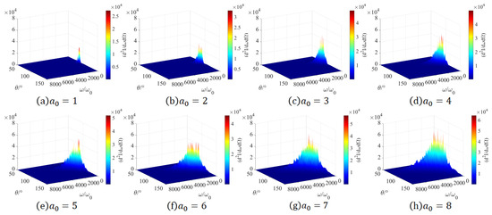 For the sake of making the research more comprehensive, we also provide the three-dimensional spectrum related to . In Figure 9, it can be comprehended that as the laser amplitude keeps increasing, the three-dimensional radiation spectrum will constantly broaden in the direction, and the cutoff frequency will also keep rising. When the laser amplitude is relatively high, it can be distinctly observed that the three-dimensional spectral diagram presents a pronounced “valley-shaped” image. Specifically, the distribution of the polar angle is relatively broad at lower frequencies, and as the frequency increases, the radiation distribution in the direction gradually becomes concentrated.
