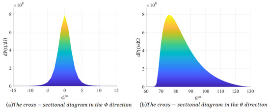 By observing Figure 4, it can be discovered that the power distribution of the electron radiation in the and directions is highly uneven, which suggests that both have a rather obvious influence on the radiation power. Hence, we select the angular distribution diagram of the electron radiation power when the laser normalized amplitude and draw the cross-sectional plots in the and directions, respectively.