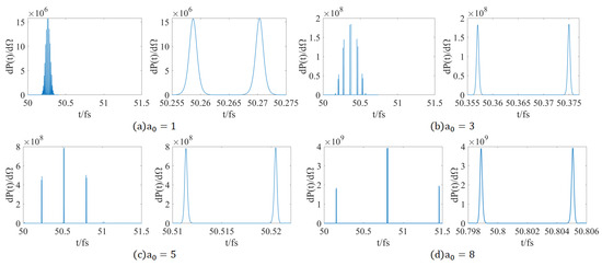 When the laser delay time is 5 fs, the temporal spectral characteristics of electron radiation are investigated in the observation direction with the maximum radiation power. As depicted in Figure 6, the position of the main peak is approximately at 51 fs, and a certain number of secondary peaks are symmetrically distributed on both sides. Generally, as the laser amplitude increases, the height of the main peak also increases rapidly, ranging from the order of magnitude to the order of magnitude, with a considerable span. This is because the increase in the laser amplitude enhances the effect of the linearly polarized Gaussian pulse on the high-energy electron, leading to a stronger radiation. As the laser amplitude increases, the position of the main peak will shift to the right correspondingly, and the coverage range of the main peak and the secondary peaks will expand. This suggests that the time for the electron to generate radiation in conjunction with the laser pulse is longer, and the time point for generating maximum radiation is retarded.