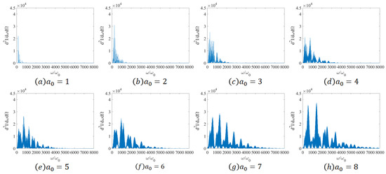 As depicted in Figure 8, with the augmentation of the laser amplitude, the spectral bandwidth of the spectrum is conspicuously broadened. On the one hand, due to the relativistic nonlinear effect, the acceleration encompasses higher-order frequency components, leading to an increase in higher harmonics. On the other hand, as a result of the Doppler effect, a certain frequency shift is generated. In contrast to the time spectrum, in accordance with the principle of Fourier transform, the spectral width of a short-time signal is proportional to . Hence, the shorter the pulse width, the broader the spectrum.