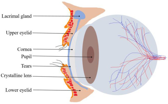 In the closed-eye state, the specific position of the eyeball cannot be localized directly by visual and conventional optical methods because the eyelid completely covers the eyeball, which poses a great challenge for eye movement tracking. However, the texture of the eyelid surface is rich in information that offers the possibility of indirectly localizing eye movements. The skin texture of the eyelid has unique features, including subtle folds, pore distribution, and tissue elasticity, which are affected by the cornea at the front of the eye and change accordingly during eye movements [33]. A sagittal cross-section of the eyeball and eyelid is shown in Figure 1. When the eye rotates, the anterior-most protruding cornea pushes against the eyelid, causing the texture of the eyelid to stretch or compress in localized areas. Such changes can be captured by high-precision image acquisition systems and then quantified using analytical techniques. Based on this principle, we can indirectly infer the trajectory and position of the eye by monitoring and analyzing the dynamic changes in the texture of the eyelid surface in real time. This approach not only avoids direct contact with the eye and the use of complex imaging equipment but also enables high-precision eye movement tracking under non-invasive conditions.