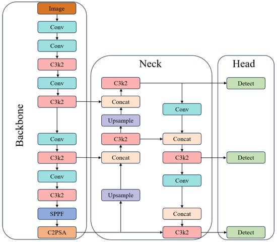 YOLO is a Convolutional Neural Network (CNN)-based target detection algorithm. YOLOv11 was unveiled at the YOLO Vision 2024 (YV24) conference and represents a significant advancement in real-time target detection technology. This new version offers substantial improvements in both architecture and training methodology, leading to enhancements in accuracy, speed, and efficiency [35]. YOLOv11’s network architecture is shown in Figure 2.