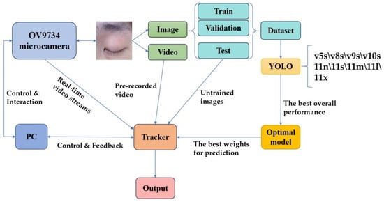 The acquisition software was developed by utilizing the camera’s application programming interface. We configured the camera to operate at a resolution of 640 × 480 and a frame rate of 30 fps, balancing image clarity with the ability to smoothly capture dynamic changes in eyelid texture. To accommodate diverse application scenarios, the acquisition software saves images in a lossless compressed PNG format, preserving fine details and ensuring the construction of a high-quality dataset. Additionally, the captured video was stored in an AVI format, enabling the recording of dynamic information across consecutive frames. This provides a robust data foundation for subsequent analysis of eye movement trajectories.