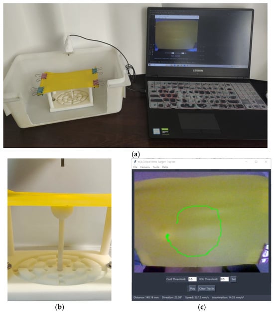 The experiments were conducted using a physical model designed to simulate eye movements, as illustrated in Figure 5a. The camera, positioned atop the physical model, captures images where 640 pixel points correspond to a 100 mm span on the plane. The displacement and velocity of the ball are derived from the pixel coordinates of its trajectory. Figure 5c presents the software interface of the tracker, showcasing the current target tracking.