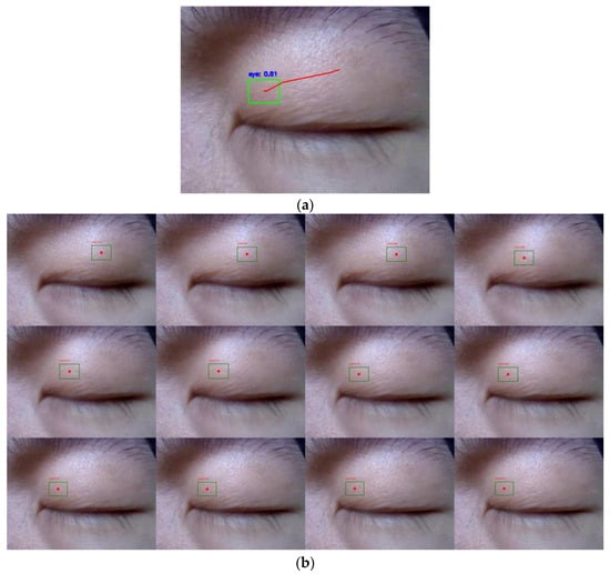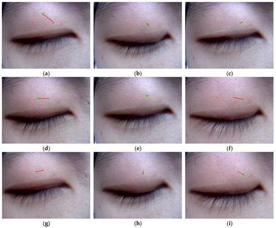 Each of the graphs in Figure 8 illustrates the subject’s ocular trajectories across five consecutive frames, where green circles denote the final frame positions and red lines indicate movement trajectories from frames 1 to 5. Notably, shorter displacement vectors in Figure 8b,h reflect the physiologically constrained vertical range of ocular motion. In Figure 8c, the model exhibits reduced tracking precision when the right eye moves in the direction toward the upper left. This limitation arises from anatomical constraints: (1) the upper-left position is in proximity to the frontal bone, physically restricting ocular mobility, and (2) there is diminished eyelid feature visibility in this quadrant. However, the system demonstrates robust tracking performance for ocular movements in other cardinal directions. Overall, the tracker’s detection trajectory matched the subjects’ eye movement patterns.