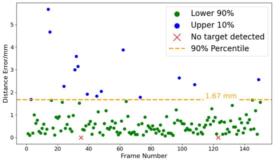 A 5 s video (150 frames) was evaluated using the tracker, with all frames labeled with ground truth bounding boxes. The predicted bounding box for each frame of the video was compared with the ground truth, and the pixel distance between the centers of the two boxes was calculated. The width of the photographed eye portion is 50 mm, covering 640 pixels in the image. According to this rule, we can calculate the distance error of the tracker. As illustrated in Figure 7 regarding the distance error of the eye movement tracker, among the 150 frames, the target was undetected in two frames, while the remaining 148 frames exhibited an average distance error of 0.77 mm. Additionally, 90% of the distance errors were below 1.67 mm, with the maximum distance error not exceeding 6 mm.