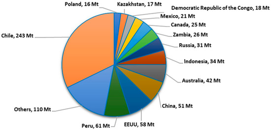 In recent years (1999–2019), approximately 752 Mt [20] of copper smelting slag have been generated from the 13 main producing countries (see Figure 2). The largest generation of this waste occurs in South America (40%), followed by Asia (13%), USA (8%), Oceania (6%), Europe (6%), Africa (6%), and others (15%).