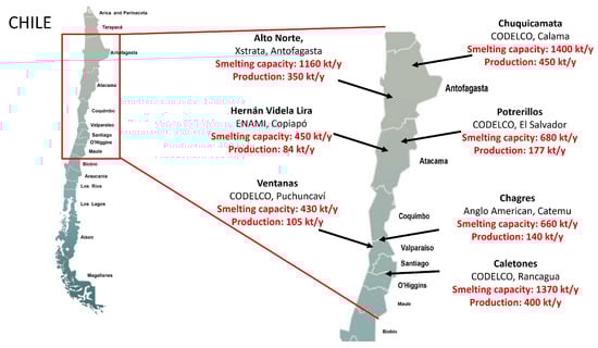 - Pérez, K.; Toro, N.; Gálvez, E.; Robles, P.; Wilson, R.; Navarra, A. Environmental, Economic and Technological Factors Affecting Chilean Copper Smelters—A Critical Review. J. Mater. Res. Technol. 2021, 15, 213–225. [Google Scholar] [CrossRef]