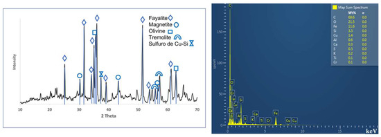 The XRD analysis of the copper slag from the Chilean smelter indicates that it is composed of, Fe2SiO4, Fe3O4, KAl2[AlSi3O10](OH)2, Cu6Si2S7, (Mg,Fe)2SiO4, and Ca2Mg5Si8O22(OH)2, show-up in the Figure 4a. Apart from the X-ray diffraction (XRD) and scanning electron microscopy with energy dispersive spectroscopy (SEM-EDS) examination shown in Figure 4, the findings in Figure 5 provide additional support for the chemical and mineralogical description of copper slag from Chile. Fe, Si, and O are the most common components in the sample, as shown by the SEM-EDS image. This is in line with the majority composition of Fe2SiO4 found in the earlier investigation.