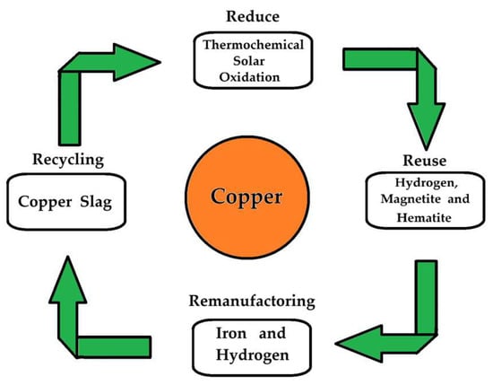 From an extensive review of the literature, it has been seen that the use of copper slag is not yet considered to be alternative for the cathode materials that currently exist in the thermolysis processes used in the production of solar hydrogen. Copper slag, due to its physical and mechanical characteristics, can be used to manufacture products such as cement, filler, railway ballast, abrasives, aggregates, roofing granules, glass, tiles, etc. In addition, valuable metals can be recovered through various extractive metallurgical routes, such as reduction by direct high-temperature smelting [1]. Shot-peened copper slag has also been used as a fine aggregate in Portland cement concrete. Wang et al. [2], indicate that the most common management for copper slag is recycling to produce value-added products, such as abrasive tools, and granule cutting tools for roofing, tiles, and road base construction [2,3,4,5]. Research related to copper slag is aimed at finding reuse applications for it as a construction material [3], using high-temperature, direct reduction in slag as a means of waste management [6], as a material for the manufacture of high-strength concrete [7], as a potential catalyst (iron present in the slag) for the depletion of phenol present in water during hydrogen peroxide (H2O2) production [8], in the recovery of valuable metals from slag [9,10,11], in the recovery of iron from copper slag by direct reduction based on coal [1], as a bifunctional photocatalyst for the degradation of alcohols and hydrogen production [12,13], in thermal energy storage systems [14,15], and in the recovery of copper and magnetite from copper slag using concentrated solar power (CSP) [16].