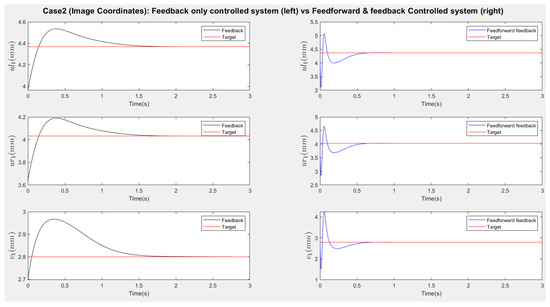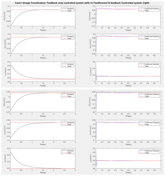 Figure 7 illustrates the overall control system architecture, designed to guide the robot manipulator so that the camera reaches its desired pose, , in the world space. This architecture follows a similar structure to that used in prior work on tool trajectory control for robotic manipulators [35]. To facilitate visual servoing, three fiducial markers are placed within the camera’s field of view, with their coordinates in the inertial frame pre-determined and represented as . Using the robot’s inverse kinematics and the eye-in-hand kinematic model, the expected image coordinates of these fiducial markers, when viewed from the desired camera pose, are computed as . These computed image coordinates serve as reference targets in the feedback control loop.