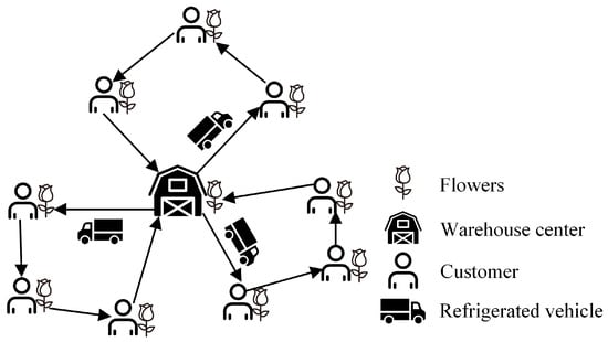 As shown in Figure 1, a fleet of homogeneous refrigerated vehicles is stationed at a central warehouse and tasked with collecting flowers from various customer-designated locations before returning to the warehouse. The locations of customers, the required flower collection weight at each site, the time windows, and the service durations are all predetermined before vehicle departure. Each flower collection point can be visited by only one vehicle, and the total weight of flowers collected along a vehicle’s route must not exceed its maximum loading capacity.