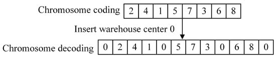 - Decoding method: During the decoding process, the integer zero, which represents the warehouse center, is inserted into the customer sequence based on the vehicles’ maximum load capacities and the customers’ time window constraints. This insertion effectively divides the sequence into multiple subroutes, each delimited by two zeros, which represent the sequence of customers served by a single vehicle. When the load of a vehicle exceeds its capacity, a zero is inserted to indicate a new route, and a new vehicle is assigned to continue the deliveries. This ensures that no vehicle exceeds its capacity while respecting the time window constraints for each customer. Each chromosome corresponds to a complete routing plan, and this encoding method guarantees that every chromosome can be successfully decoded into a feasible solution. This process is illustrated in Figure 3.