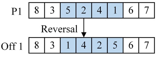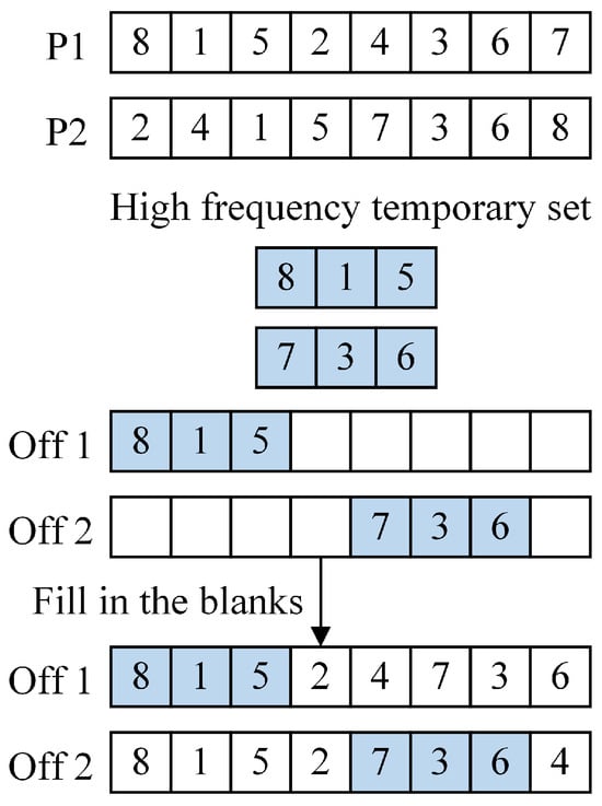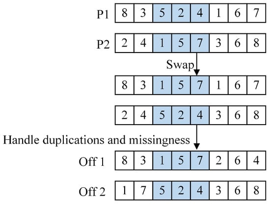 PMX is a widely used genetic operator in combinatorial optimization, recognized for its ability to preserve partial genetic structures from parent solutions while generating new offspring. In the GN_CSWA, PMX is applied during the global search phase to enhance diversity and improve solution quality. Individuals are paired from the population selected by the three selection mechanisms described in the previous section, and each pair is traversed sequentially. For each pair, if a randomly generated number is less than the predefined crossover probability, the crossover operation is performed to generate new offspring; otherwise, the pair remains unchanged. The process is illustrated in Figure 4 and follows these steps: (1) Two crossover points are randomly selected to determine the crossover interval, and the gene sequence within this interval is mapped to the offspring as a retained fragment. (2) Two offspring individuals are produced by exchanging the retained gene segments between parent 1 and parent 2 within the crossover interval. (3) After exchanging gene segments, duplicate or missing genes may appear. To address this, the offspring must be repaired by correcting any duplicates or omissions, ensuring that each generated offspring is a valid solution.