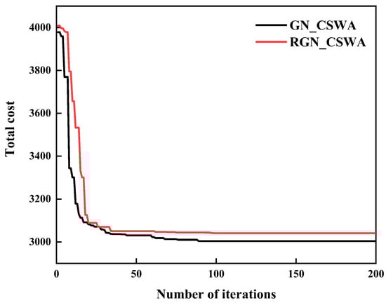 To verify the significance of the experimental results, a significance test was conducted on all total cost data, with the significance level set to . Before performing the significance test, a normality test was conducted on all total cost data using the Shapiro–Wilk test, with the null hypothesis stating that the data follow a normal distribution. The normality test results for the first and second datasets were and , both greater than the significance level of 0.05, indicating that both datasets conform to the normality assumption. Therefore, the data meet the prerequisites for subsequent analysis of variance. Following this, the significance test was performed, and the variance analysis result was , which is less than 0.05. This indicates that the GN_CSWA significantly outperforms the RGN_CSWA in the experimental results, and this difference is statistically significant. Figure 8 shows the convergence curves of the optimal solutions for both algorithms. As can be seen from the figure, the GN_CSWA not only converges faster but also finds better solutions. Therefore, combining random generation and nearest neighbor algorithms to generate diverse and high-quality initial solutions helps the algorithm find better solutions.