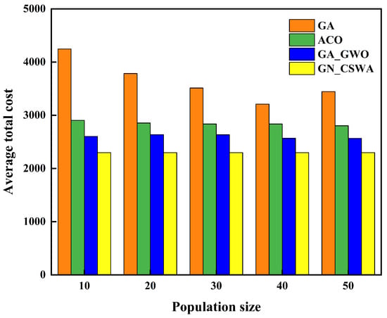 Comparison graph of average total costs of four algorithms based on different population sizes.