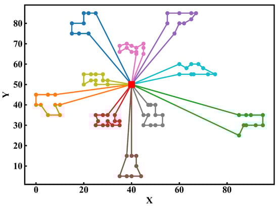 To evaluate the impact of different parameter settings on the performance of the GN_CSWA, this study designed eight groups of comparative experiments with varying parameter combinations. Each key parameter was set at two levels (high and low) to systematically examine how changes in parameters affect algorithm performance. Each group of experiments was independently run 10 times based on the benchmark instance C101, and the results are presented in Table 11. The average total cost shown in the table represents the mean value obtained from 10 independent runs for each parameter group. The experimental results indicate that the algorithm exhibits relatively small performance fluctuations under different parameter combinations, suggesting that GN_CSWA has good stability. Since the parameter configuration in Group 8 achieved the best performance in terms of total cost, it was selected as the final parameter setting for GN_CSWA in this study. The optimal vehicle collecting routes obtained under this configuration are illustrated in Figure 10, where different colors represent the collecting routes of different vehicles.