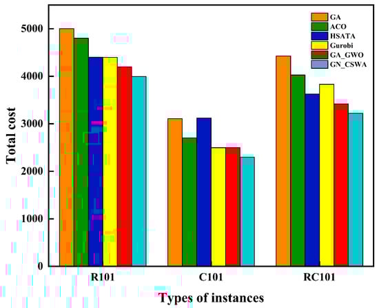 To verify the effectiveness of the proposed GN_CSWA, this study employs five algorithms (GA, ACO, HSATA, GA_GWO, and GN_CSWA) as well as the commercial optimization solver Gurobi to solve benchmark instances R101, C101, and RC101. The experimental results of the six methods are compared and analyzed, as shown in Table 12. In the table, the average total cost refers to the average value obtained from ten independent runs of each heuristic algorithm on each instance. Since Gurobi, as a commercial solver, has deterministic characteristics and produces consistent results under the same problem settings, its result from a single run is used as a reference. The experimental results show that GN_CSWA achieves the lowest total cost in all three instances (R101, C101, and RC101), indicating better solution performance. In addition, based on the variance values of the results from each algorithm, GN_CSWA demonstrates higher stability.