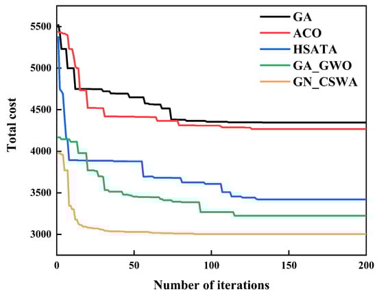 Figure 12 shows the convergence curves of the optimal solutions obtained by running five algorithms independently 10 times on real map instances. As seen from the figure, GA performs poorly because its search operators only use PMX crossover and inversion mutation operations, leading to high randomness. Next is ACO, where the traditional ACO algorithm has a slow convergence speed and is prone to getting trapped in local optima. In contrast, HSATA and GA_GWO show improved performance over GA and ACO by utilizing large neighborhood search operators. However, although the operators of HSATA and GA_GWO consider spatial distance, they do not fully account for other factors, such as time distance, that impact the optimization results. GN_CSWA significantly improves both convergence speed and solution quality by integrating search operators that consider multiple factors, including spatial, temporal, and intra- and inter-subroute elements. Moreover, GN_CSWA generates initial solutions using both random and nearest neighbor algorithms, which results in an initial solution that is clearly better than those of the other four algorithms. With this better starting point, GN_CSWA can converge more quickly and obtain better solutions, thereby significantly reducing the total cost.