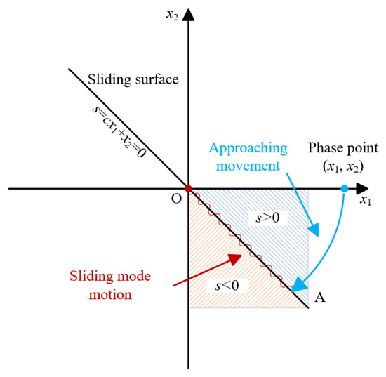 Following this, the design concept of the system phase point (x1, x2) lies on the positive half-axis of x1. Under sliding mode control, its trajectory is shown as the red line in Figure 4.