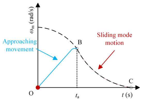During the position step response process, the approximate variation trend of the given speed ωmref and the actual speed ωm is shown in Figure 5. Segment OB represents the approaching movement, and segment BC represents the sliding mode motion. Point B corresponds to point A in Figure 4. Usually, the stage where the actual speed decreases at the end (segment BC) is referred to as the positioning stage. The motion equation during the positioning stage is given by Equation (9), where the acceleration dωm/dt is negative.