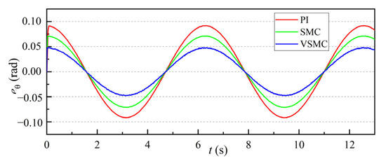Figure 9 displays the simulation curves of position response errors for each control method. The initial response error of PI control is approximately 0.18 rad, with a tracking error range from approximately −0.09 to 0.09 rad; the initial response error of SMC is 0.15 rad, with a response error range from approximately −0.075 to 0.075 rad. The initial response error of VSMC is 0.1 rad, with a tracking error range from approximately −0.05 to 0.05 rad. These results show that VSMC reduces both the initial response error and the error range compared to the PI and SMC methods.