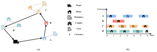 In addition, due to the division of urban areas (e.g., work, living, and recreational areas) and the differences in the living habits of customers, logistics companies often have to make secondary deliveries due to the absence of the customer when designating the delivery location [10], which leads to a reduction in the efficiency of delivery. Obviously, this not only has a negative impact on transport cost but is also detrimental to the achievement of ecological goals. Current delivery models usually allow customers to choose only one delivery location; however, since the customer’s activity location is not fixed, this can easily lead to a mismatch between the customer’s actual activity location and the selected delivery location. To address this problem, this paper proposes a new delivery model that allows customers to provide flexible optional delivery locations in a single delivery service, thereby improving delivery flexibility. This improvement is expected to reduce the occurrence of secondary deliveries and enhance logistics efficiency while reducing transport costs and environmental impact.