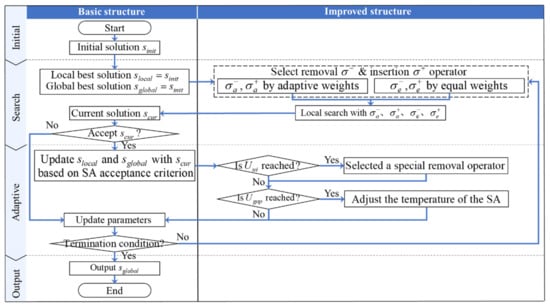 The algorithm determines the selected removal and insertion operators based on the different scores in each generation of search. When the neighborhood solution is not improved, the solution is accepted by simulated annealing strategy. Simulated annealing is a commonly used adaptive mechanism in ALNS [40,41,42,43], as shown in Section 4.4. Compared to other adaptive strategies, the simulated annealing approach effectively balances simplicity and efficiency. Its mechanism is straightforward and clear, while also effectively controlling the LNS in selecting different neighborhood structures. This ensures high search efficiency and helps avoid getting trapped in local optima, thus ensuring the quality of the solution.